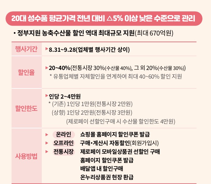 추석민생안정대책은 크게 성수품 물가안정, 민생부담 경감, 내수활성화 3가지로 나눠져 있는데. 아래에서 하나씩 알아보겠습니다.